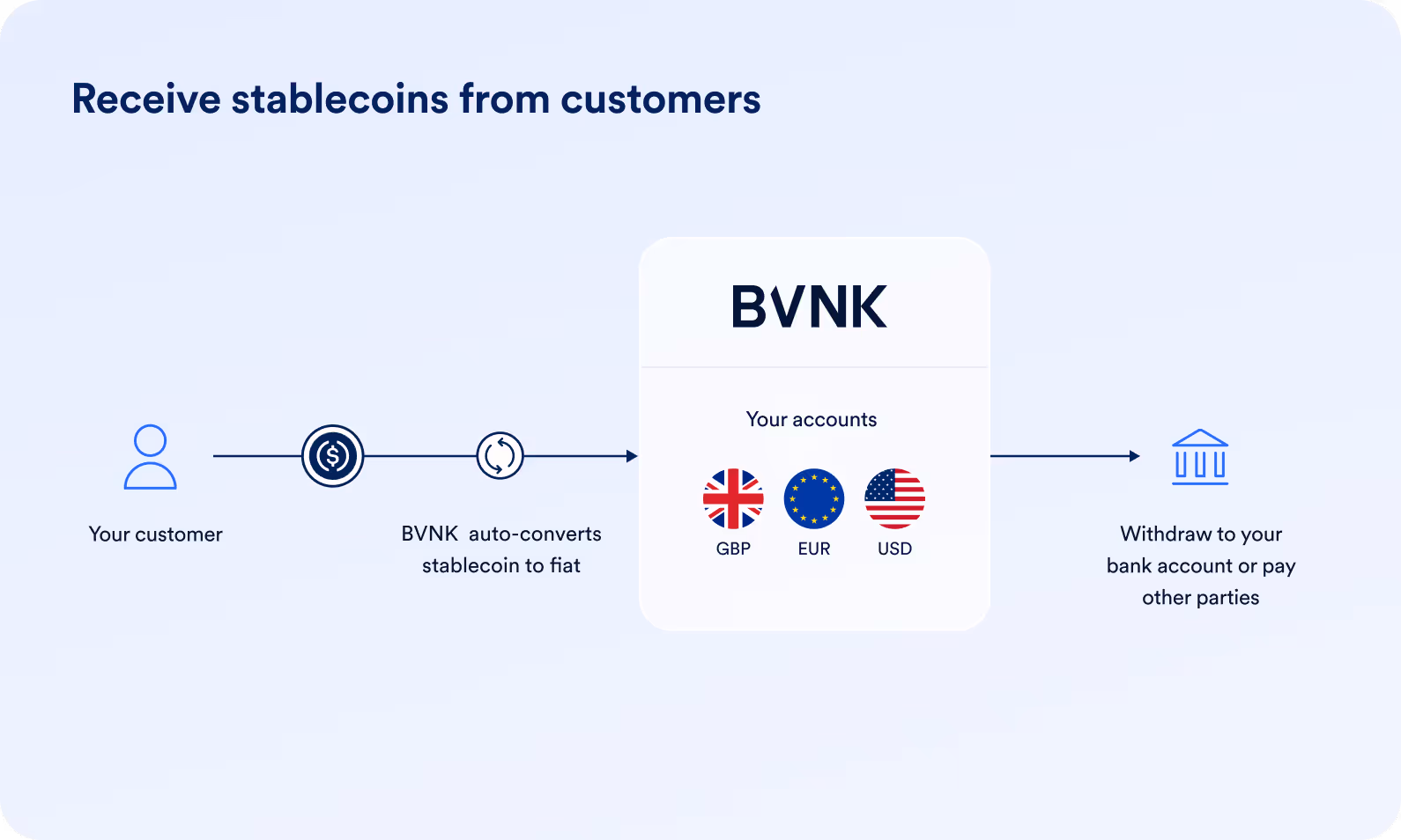 Working with payment partners like BVNK offers an additional layer of protection through auto-conversion capabilities. This means businesses can accept stablecoin payments without holding digital assets on their balance sheet.